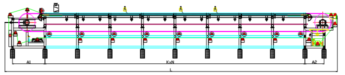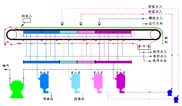 以濾布為過濾介質(zhì),采用整體的環(huán)形橡膠帶作為真空室。環(huán)形橡膠帶由傳動裝置傳動做直線運(yùn)行,通過密封系統(tǒng)實(shí)現(xiàn)料漿的固液分離。當(dāng)真空系統(tǒng)介入時,固體被載流在濾帶上通過刮刀卸除,液體被自動排液罐接收并通過水封裝置或切換裝置排出,濾布經(jīng)過高壓沖洗液在線連續(xù)清洗獲得再生。實(shí)現(xiàn)物料從進(jìn)料、脫水、順逆流洗滌、卸渣、濾液排放、濾布清洗和糾偏不間斷的連續(xù)進(jìn)行。